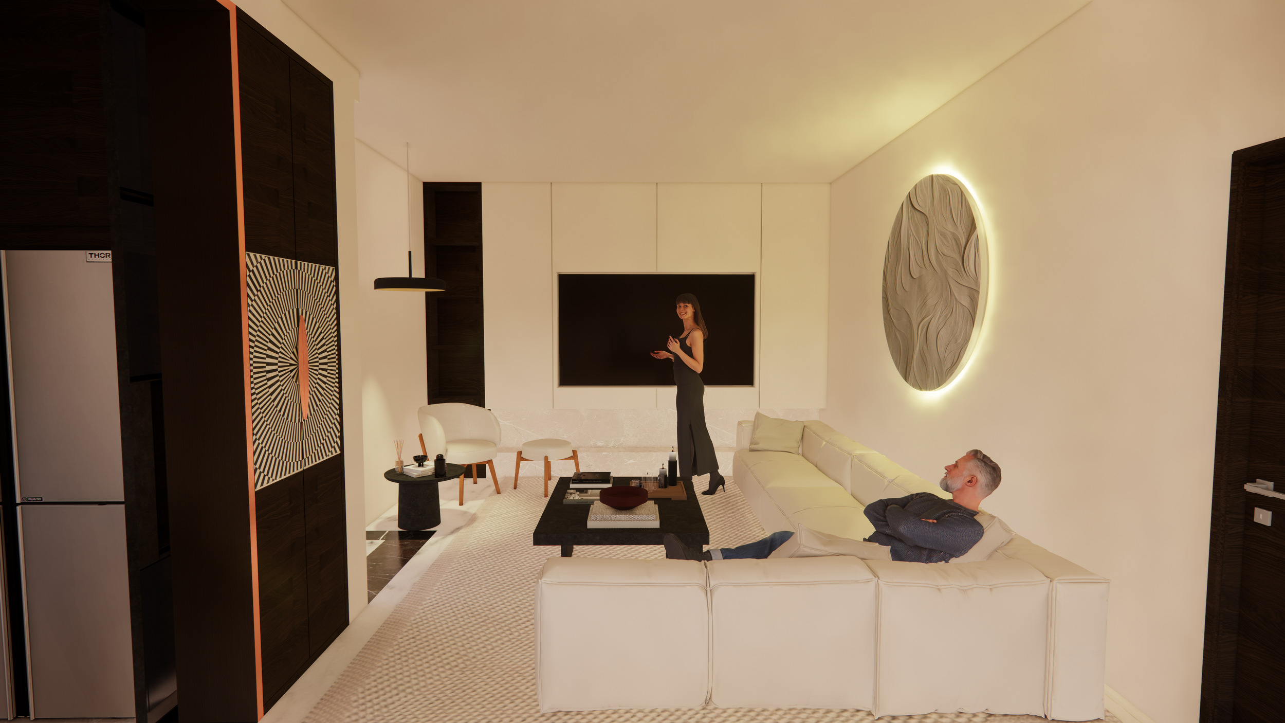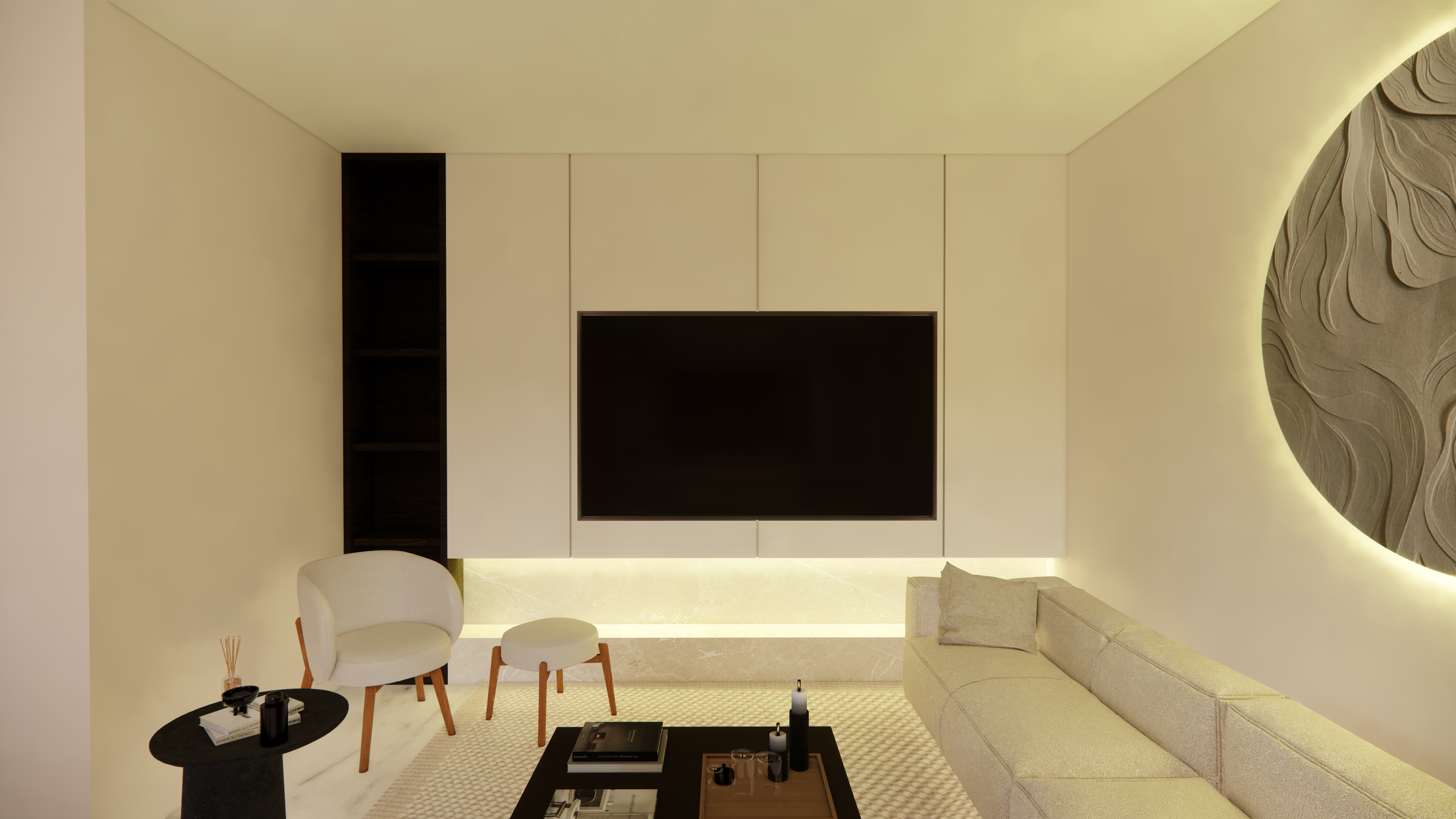 For example - While the living room decor and sofa was updated the existing cabinetry was just updated by adding a marble slab that connected the otherwise disjointed feel - bringing it all together in a simple yet effective way.